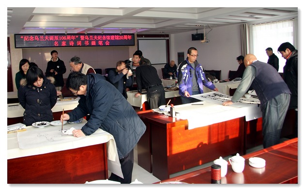 2012年12月23日是乌兰夫同志诞辰106周年,也是乌兰夫纪念馆建馆20周年。这天乌兰夫纪念馆的干部职工和邀请来的书画名家齐聚乌兰夫纪念馆以现场书画笔会的形式来纪念和缅怀在长达60多年的革命生涯中,为我国革命和建设,为巩固祖国统一,加强民族团结,为中华民族的复兴和发展,做出了重要贡献,深受全党全国各族人民尊重和爱戴的乌兰夫同志。