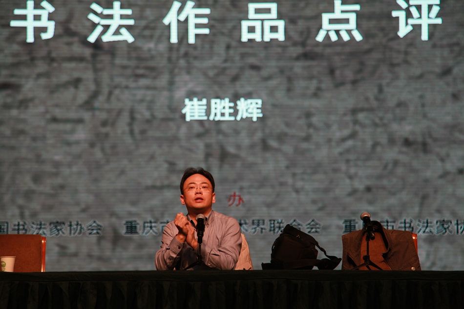 下午的点评活动,由重庆市书法家协会驻会副主席漆钢主持。中国书协培训中心教授崔胜辉在授课中简要介绍了中国书协关于举办此次大讲堂活动的目的意义,强调了书法创作要把握的深度和高度等理念。在作品点评中,他对如何对待作品的形式问题,如何取法、如何深入经典,如何用字、用纸、用笔以及创作方向进行了耐心细致的点评,对不足的地方提出了改进意见。他的点评朴实无华,有很强的针对性,对提高书法作者的艺术创作水准和眼光极具指导意义。(元萧生)